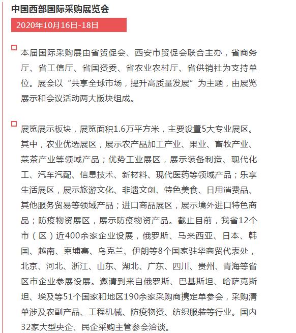 中國西部國際采購展覽會(huì)(以下簡(jiǎn)稱“國際采購展”),于2020年10月16日-18日在西安國際會(huì)展中心展覽館1號(hào)展廳舉行。本屆國際采購展以“共享全球市場(chǎng),提升高質(zhì)量發(fā)展”為主題,深度融入共建“一帶一路”,助力陜西打造內(nèi)陸改革開放高地,落實(shí)好穩(wěn)外資、穩(wěn)外貿(mào)的要求,更好服務(wù)疫情常態(tài)化形勢(shì)下企業(yè)開拓國際市場(chǎng)。我公司受西安貿(mào)促會(huì)邀請(qǐng)參加本次展覽會(huì)。